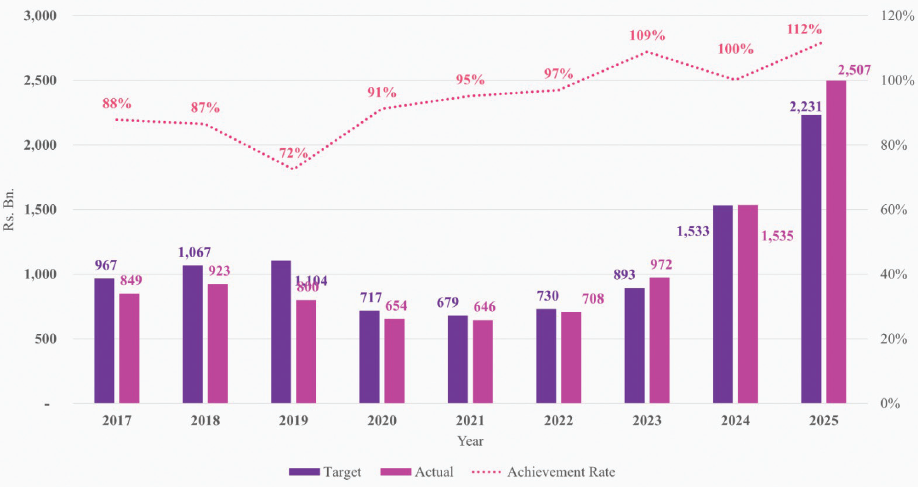 එමෙන් ම 2017 වසරේ සිට ලබාගත් ආදායම් වාර්තාවල සඳහන් වන ආකාරයට රේගුවේ වාර්ෂික ආදායම් අපේක්ෂාව ඉලක්කගත සීමාවට වඩා පහළින් තිබී ඇති. එය 2017 වසරේදී රුපියල් බිලියන 80 ක් ද 2018 වසරේදී රුපියල් බිලියන 144 ක් ද 2019 වසරේදී රුපියල් බිලියන 300 ක් ද 2020 වසරේදී රුපියල් බිලියන 63 ක් ද 2021 වසරේදී රුපියල් බිලියන 33 ක් ද 2022 වසරේදී රුපියල් බිලියන 22 ක් ද වශයෙන් හඳුනා ගත හැකියි. එහෙත් 2023 වසරේ සිට ශ්රී ලංකා රේගුවට ඉලක්කගත වාර්ෂික ආදායම් අපේක්ෂාව ඉක්මවා යමින් අමතර ආදායමක් උපයා ගැනීමට හැකි ව තිබෙනවා. 2024 වසරේ ද රුපියල් ට්ර්ලියනය ඉක්ම වූ ආදායමක් ලබා ගැනීමටත් එය 2025 වසරේදී රුපියල් ටි්රලියන දෙකහමාර ඉක්ම වූ ආදායමක් බවට වැඩි කර ගැනීමටත් හැකි වී තිබෙනවා.